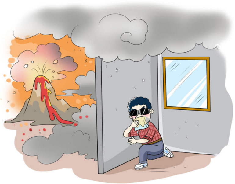 1.14.2 用口罩或湿布捂住口鼻,阻挡火山灰和有毒气体。穿长袖衣物、佩戴护目镜,防止皮肤和眼睛被高温碎屑灼伤。
